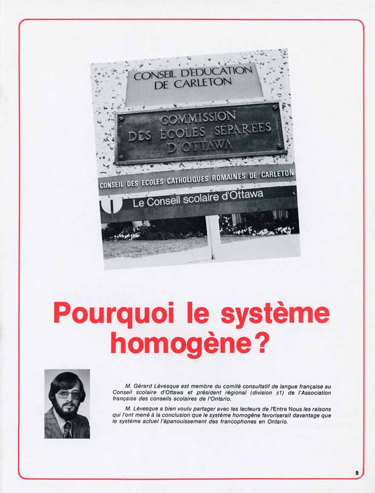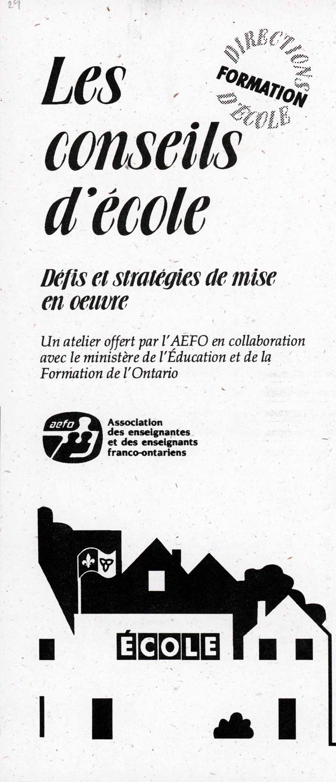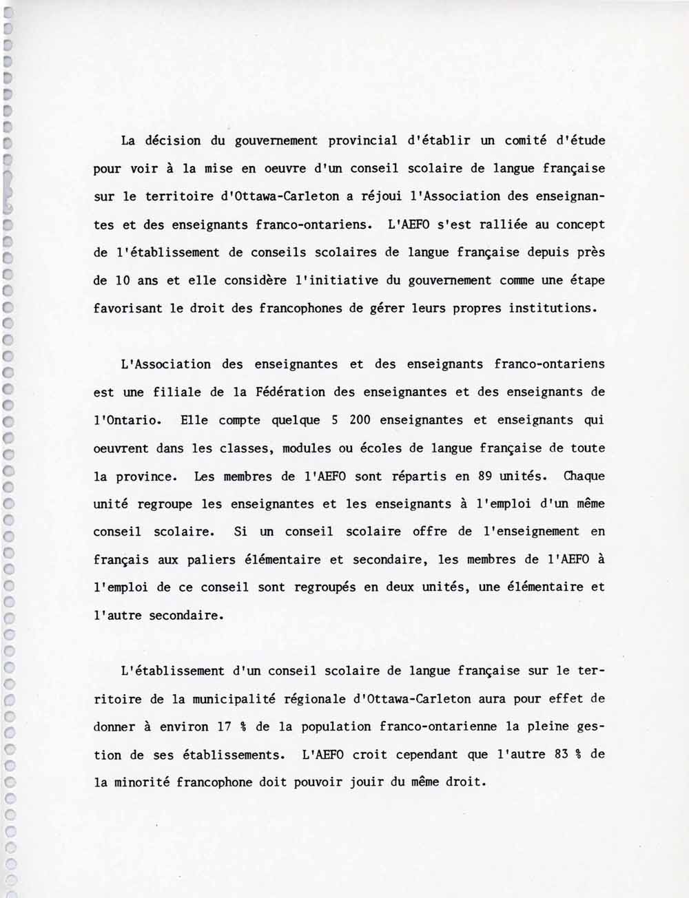 Dans un mémoire présenté au Comité d’étude sur l’éducation de langue française d’Ottawa-Carleton, le 29 avril 1986, l’AEFO réclame des conseils scolaires homogènes de langue française pour l’ensemble de la province.Premiers conseils scolaires de langue française