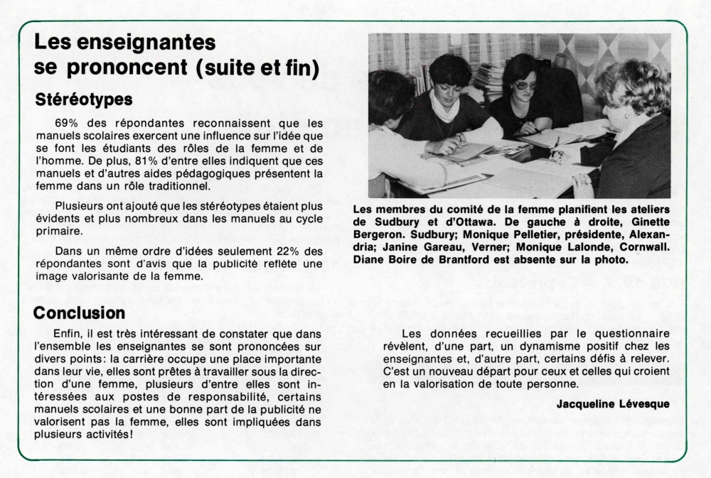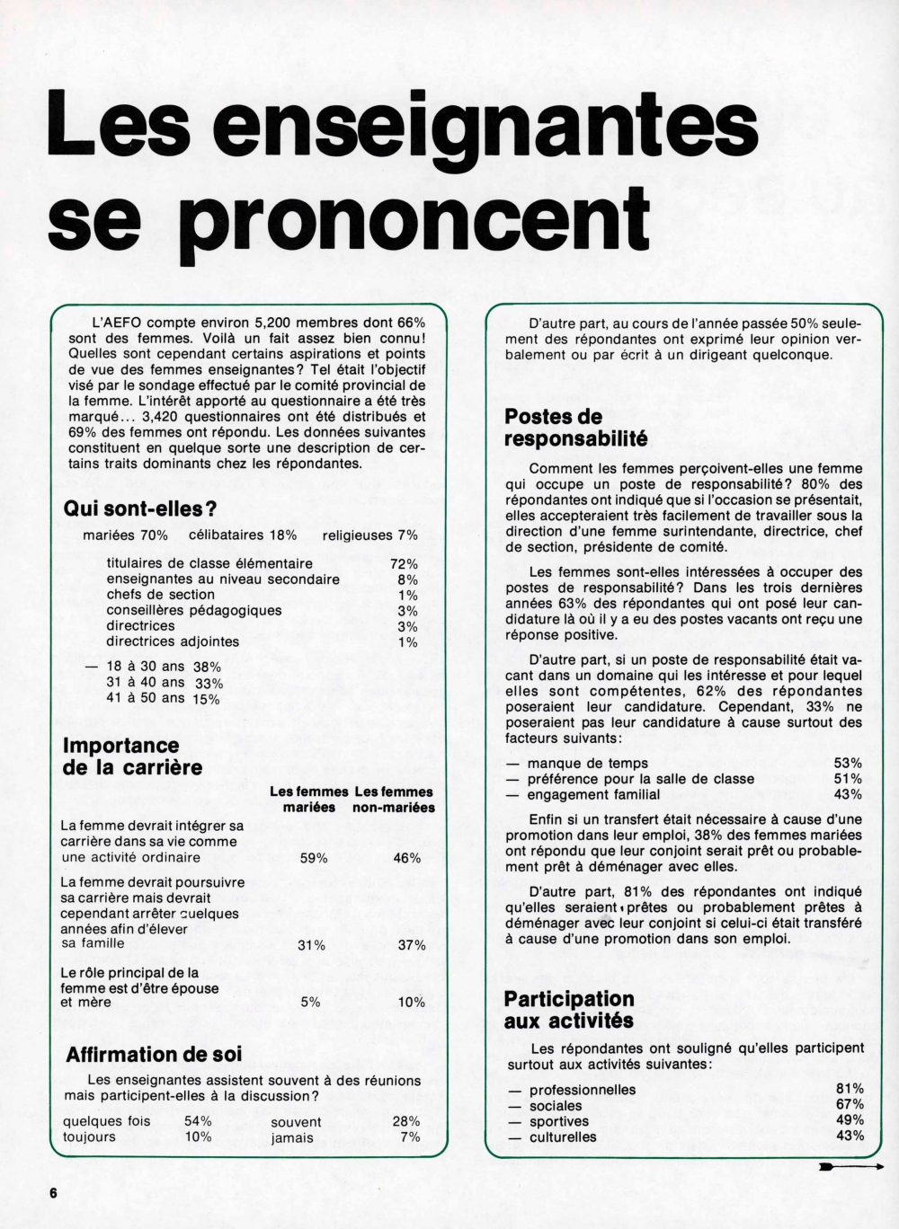 À partir de 1975, le Comité de la femme oriente le travail de l’AEFO dans plusieurs sphères d’activité. L’AEFO révise toutes les conventions collectives des enseignantes et des enseignants et se fixe des objectifs de négociation pour en éliminer les discriminations de toutes sortes. L’Association revendique des améliorations aux congés de maternité, adopte une ligne de conduite sur le travail à temps partiel, négocie des programmes d’équité salariale et organise des sessions d’information sur l’équité salariale à l’intention de ses membres.