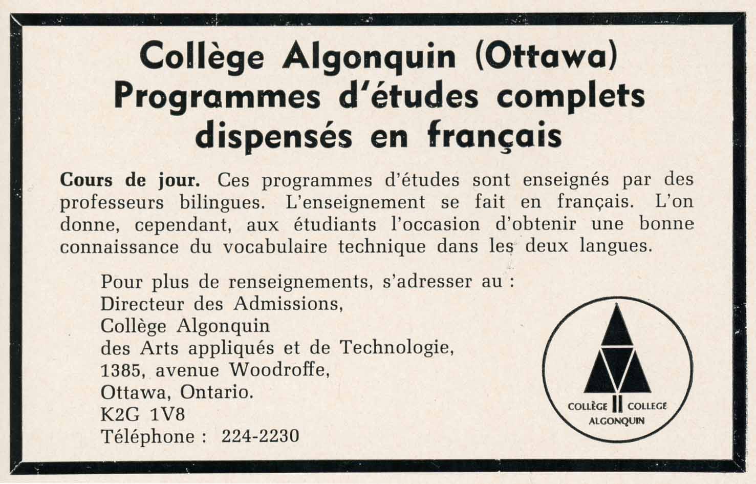 Lors de la fondation des premiers collèges communautaires, dans les années 1960, l’AEFO prône la création d’institutions francophones. Toutefois, la voix des francophones ne sera pas entendue et ceux-ci devront se contenter de programmes bilingues dans des institutions anglophones comme le collège Algonquin à Ottawa et le collège St. Lawrence à Cornwall.