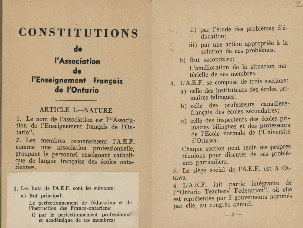 Dans la constitution adoptée au premier congrès de l’AEFO en mars 1940, la mission de l’organisme est définie de la façon suivante :