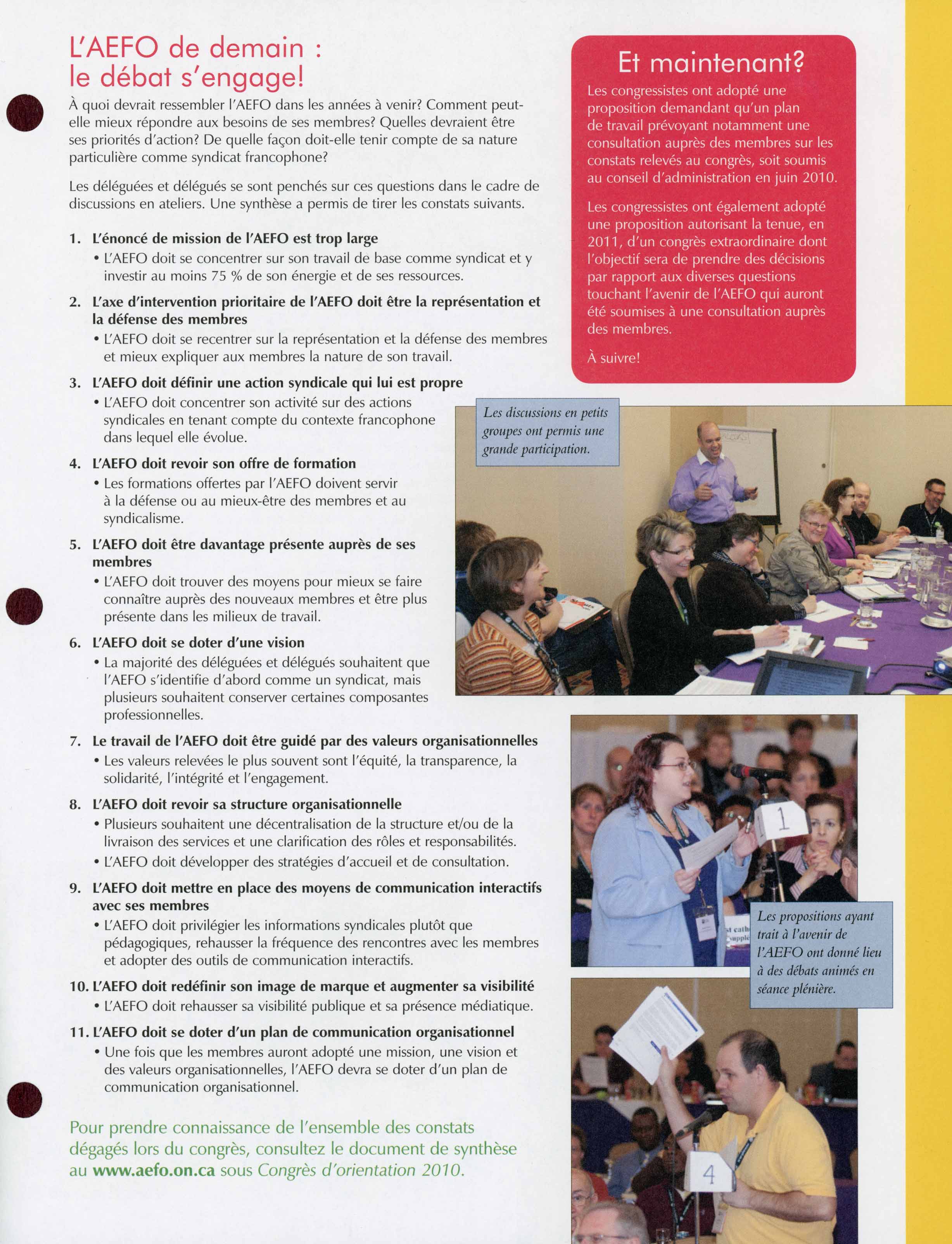 Tel que rapporté dans En bref du 26 mars 2010, un débat sur la mission de l’AEFO s’engage au congrès 2010.