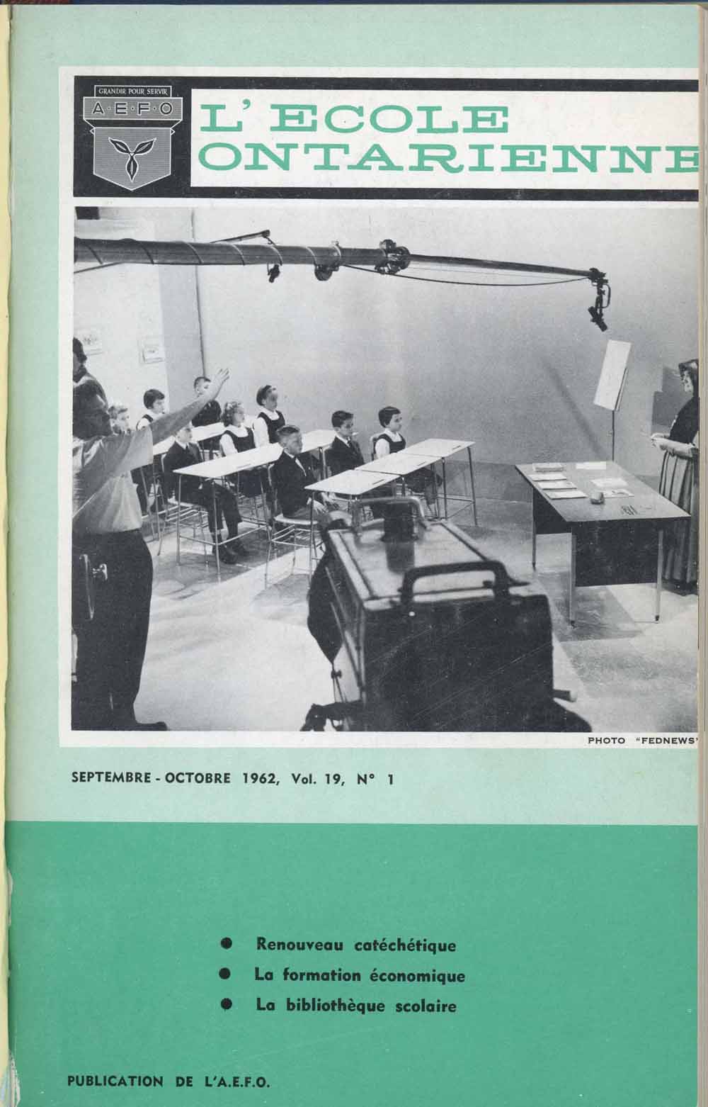 Dans les années 1950, l’AEFO s’intéresse à l’utilisation du matériel audiovisuel à des fins d’enseignement. Les vertus du gramophone, puis de la télévision pour appuyer l’enseignement sont étudiées et discutées régulièrement dans les pages de L’École ontarienne. Les auteures et auteurs d’articles sur la question s’inspirent de l’expérience des États-Unis et d’écoles à Montréal et à Toronto, pour faire la promotion du matériel audiovisuel comme outil d’apprentissage et encouragent les enseignantes et les enseignants à l’utiliser dans leur salle de classe.