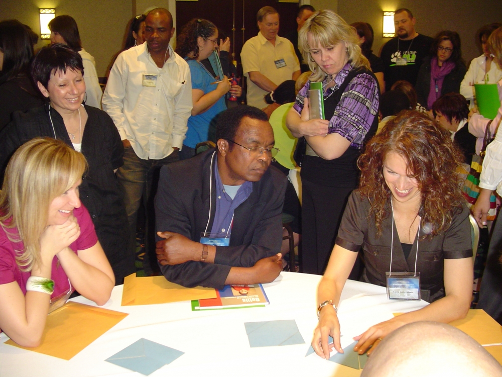 Des membres de l’AEFO échangent de bonnes idées à la foire Partage du savoir à Toronto, en novembre 2009. Cette foire annuelle s’inscrit dans le Programme d’apprentissage et de leadership du personnel enseignant (PALPE) qui, depuis 2007, permet aux enseignantes et enseignants de recevoir une aide financière du ministère de l’Éducation pour mettre en œuvre un projet pédagogique de leur choix. L’AEFO est partenaire de ce projet qui renforce l’autonomie professionnelle des enseignantes et des enseignants.
