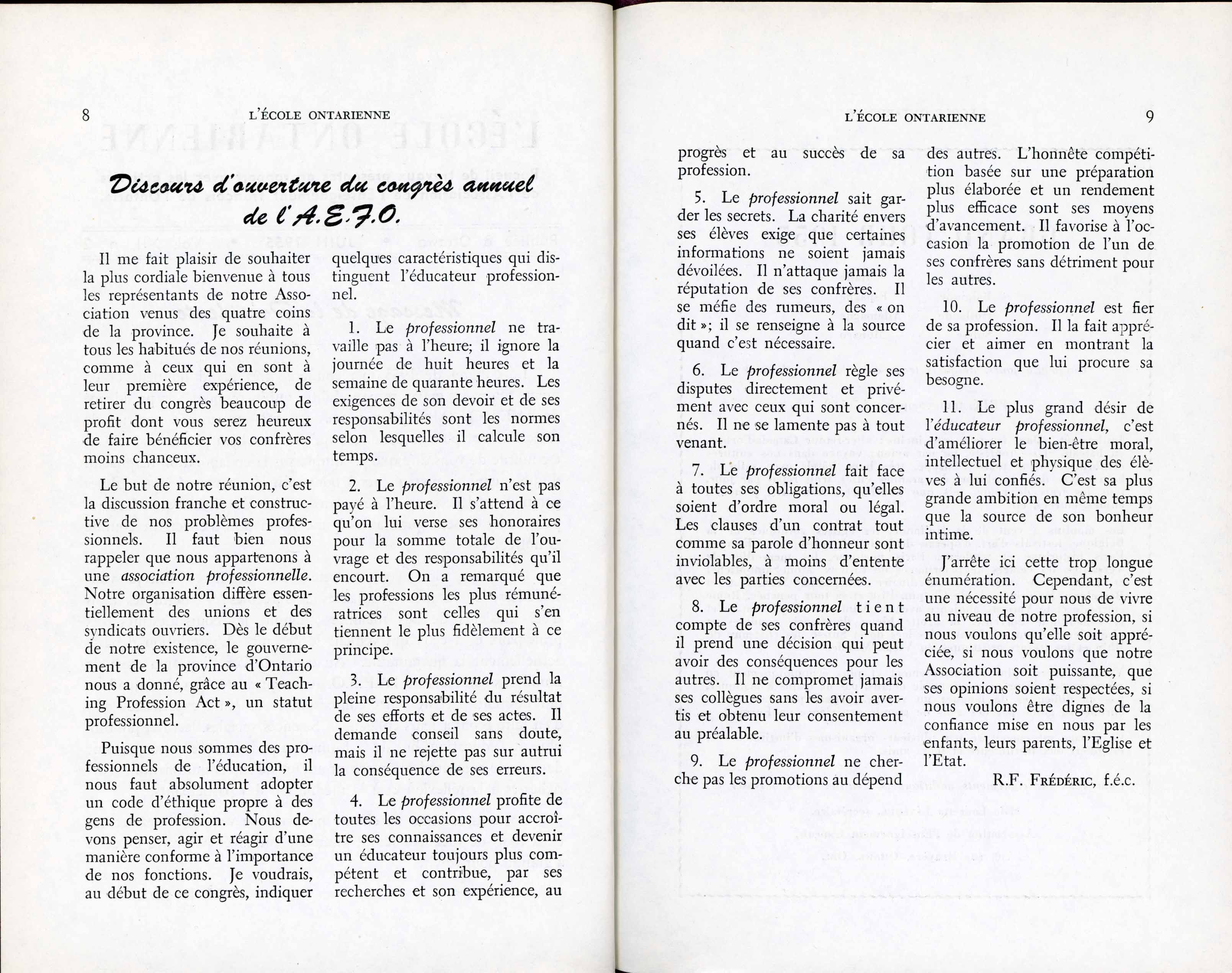 Toutefois, l’action de l’AEFO demeure timide. Elle ne souhaite pas empiéter sur l’autonomie des communautés locales. De plus, elle s’inscrit toujours dans une conception traditionnelle de la profession enseignante, davantage considérée comme une vocation et marquée par le dévouement et le sens du devoir. Le discours d’ouverture du congrès de 1955 reflète bien la vision de l’AEFO à l’époque.
