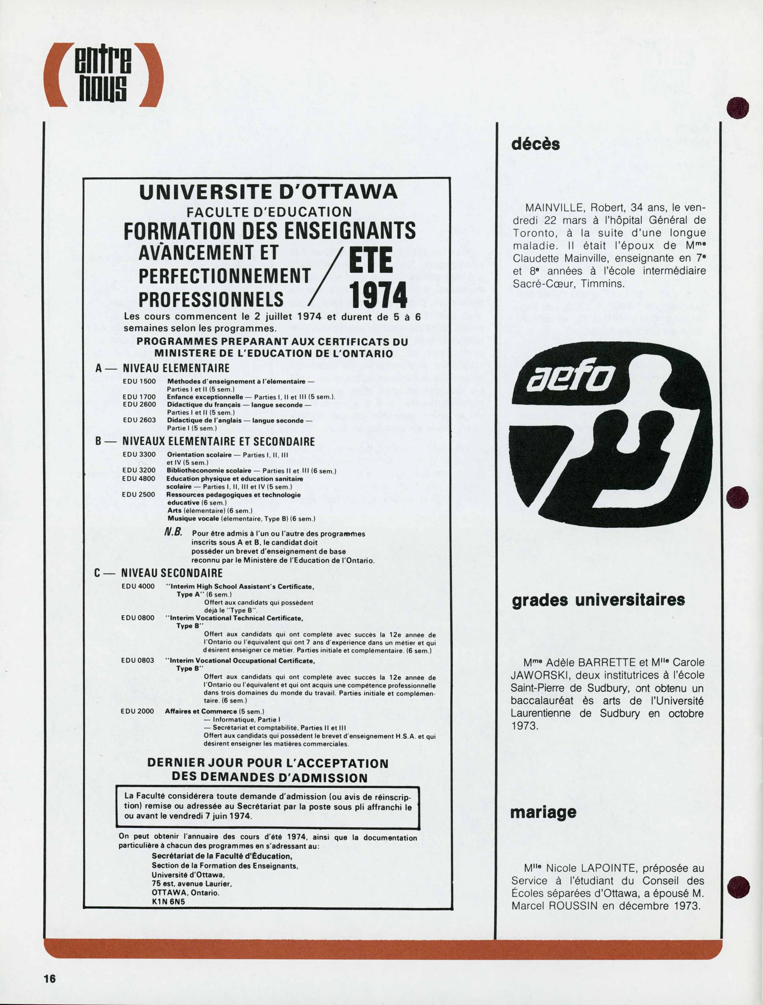 Une annonce dans le bulletin Entre Nous de mai 1974 incite les enseignantes et les enseignants à s’inscrire à des cours d’été.