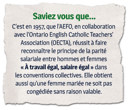 En 1957, l’AEFO, en collaboration avec l’Ontario English Catholic Teachers’ Association (OECTA), réussit à faire reconnaître le principe de la parité salariale entre hommes et femmes « À travail égal, salaire égal » dans les conventions collectives. Elle obtient aussi qu’une femme mariée ne soit pas congédiée sans raison valable.