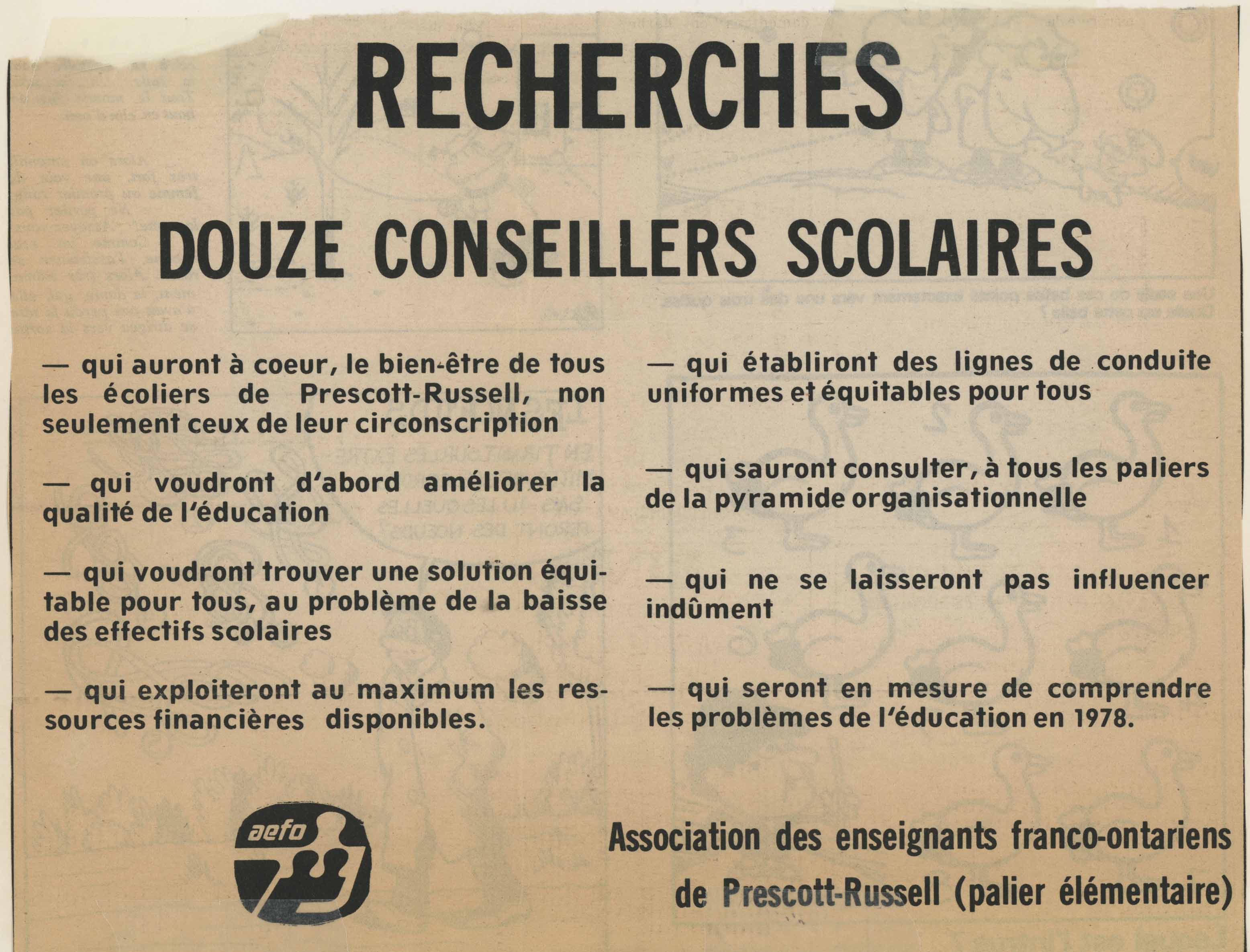 En 1974, l’AEFO fonde le Comité d’organisation et d’orientation politique. Cette initiative vise à contrecarrer les mesures antisyndicales du gouvernement de l’époque et aussi à favoriser l’expansion de l’enseignement en français par une meilleure représentation francophone au sein des conseils municipaux et des conseils scolaires.